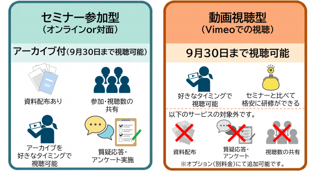 | eラーニング (約30分) | 全従業員向け | 動画視聴型 (配信期間:9月30日迄) | 【特価】33,000円 (先着100社限定) |